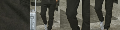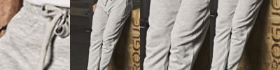 60% ringspun cotton/40% polyester. Unbrushed. Elasticated waistband with drawcord. Two side SBS zip pockets. Cuffed leg ends.
