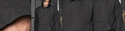 60% ringspun cotton/40% polyester. Unbrushed.Drop shoulder style.Two panel double layer hood.Taped neck.Left sleeve SBS zip pocket.Front pouch pocket.Self fabric cuffs and hem.