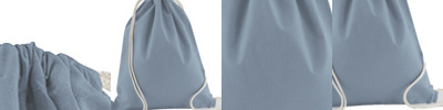 100% organic cotton. Organic or in-conversion to organic cotton.Rope drawcord closure.Cut out label.Capacity 12 litres.