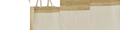 Unlaminated starched jute. Cotton carry handles (40cm long).Cotton canvas front pocket.Cut out label.Capacity 14 litres.