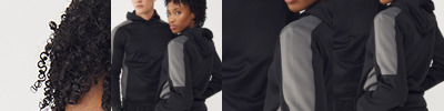100% polyester. Brushed back fleece.Drop shoulder style.Three panel hood.Crossover neck detail.Contrast shoulder, upperarm and side panels (black and navy are self colour).Two front zip pockets.Ribbed cuffs and hem.Tear out label.