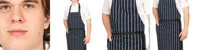 65% polyester/35% cotton. Easy care.Bleach resistant.Self fabric neckband with sliding, adjustable buckle.Anti-tangle ties.Single side pocket.Reinforced straps and pocket.Width 84cm.Length 96cm.Industrial or domestic wash 65°C.