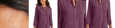 Comfortable and flattering, this long tunic has timeless style and endless versatility. 4.5-ounce, 100% polyester textured crepe Open collar Full-button front Faux black shell buttons Two button-through patch pockets Bust darts Roll sleeves with button tabs Back yoke with box pleat Longer length Elongated side slits