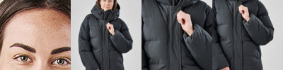 Pure Earth by STORMTECH™. STORMTECH two-layer H2XTREME® 15000/10000 waterproof/breathable outer shell. STORMTECH Thermolex™ high loft synthetic down. Durable, PFC-free, water-repellent finish. High-performance, windproof outer shell. Articulated elbows. Bomber-style length. Elastic hem and cuff trim. Ultra-warm, zipped hand pockets. Full-coverage insulated hood with face shield. Zip-off insulated hood trim, reinforced. Flexible hood opening. Internal storm flap with brushed tricot. Thermal reflective lining. Internal mesh stash pockets. Internal zipped chest pocket. Decoration access.