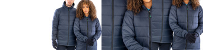 Heavy duty zip through collar with chin guard and zip pull Black elasticised black bound cuff and hem Soft feel poly wadding Zipped pockets Inside pockets Hang loop Budget CORE range Fashionable quilted design Recycled fabric using environmental-friendly materials made from recycled plastic bottles and post-industrial waste offering a sustainable equivalent to conventional yarns End of life recyclable Fabric: Outer: 100% recycled nylon Padding: 260gm² 100% recycled polyester Lining: 100% recycled nylon
