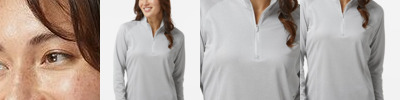 * Ventura Suede Knit 6.34-ounce * Solids, 89% recycled polyester/11% spandex * Heathers, 45% recycled polyester/44% polyester/11% spandex * Wicks moisture * Ladies' fit * Tag-free label * Quarter zip pullover with covered placket zipper * Dropped shoulder sleeves for mobility and comfort * Modest cropped length with drop tail * Side vents