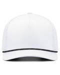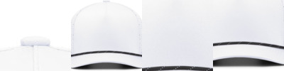 100% recycled polyester twill. 2 panel. Wide panel band. 8 stitch line brim. White reverse. Tag free.