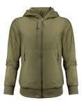Shell fabric; 100% PES, cire finish on the inside with 100% PES padding (Thermolite® Micro 60 g/m²). Lining; 100% Nylon Quilted lightweight jacket Fully lined with inverted hood in the collar (invisible zip at top of collar) Reversed coil zip at C.F, front pockets and chest pocket Invisible zip on the inside for embroidery/ print Elastic binding at bottom hem and sleeves Jacket can be tucked in the front pocket to transform to a travel bag Normal machine wash at 40 degrees Do not iron Do not tumble Also available in ladies sizes code HAR2121032