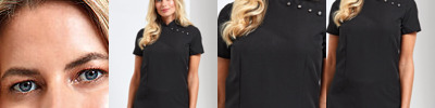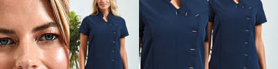 Beauty and Spa tunic with Mandarin collar. Side yoke detail with 4 feature buttons and satin trim. Princess seams and bust darts for flattering fit. Side vents. Back zip fastening. Satin piping to collar edge. Short sleeves. Easycare. Size 8, 10, 12, 14,16, 18, 20, 22, 24