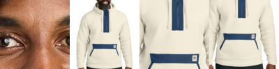 - Kangaroo pocket with woven front flap covered zippered pocket