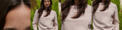 Set-in sleeve. 1x1 rib at neck collar and sleeve cuffs. Double-needle topstitches at the bottom hem. Inside back neck tape in self-fabric. Slightly rougher fabric characteristic.