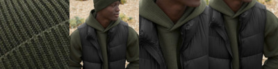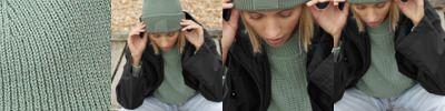 - 2x2 chunky rib, 1" neckband, back neck binding, waistband and sleeve cuffs