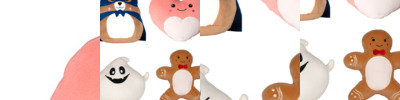 95% polyester/5% elastane. Soft plush toys - white ghost, blue hero bear, light brown gingerbread man and pink heart.Embroidered facial features.White front panel.Height ranges from 23cm up to 25cm.Suitable for vinyl print and sublimation.