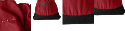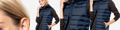 290T polyester outer. Polyester padding. Collar high full length nylon zip and pull. Two front zip pockets. Two inner pockets. Hang loop. Elasticated bound armholes and hem. Tear out label. Packs away into storage bag.