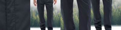 65% recycled polyester/35% cotton twill. Windproof and breathable. Expandable waistband with belt loops. Zip fly with button over. Two side pockets. Cargo pockets on both legs. Rear pockets with with tear release flap closure. Triple stitched seams. Critical stress point bar tacking. Cut out label.